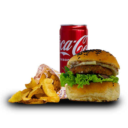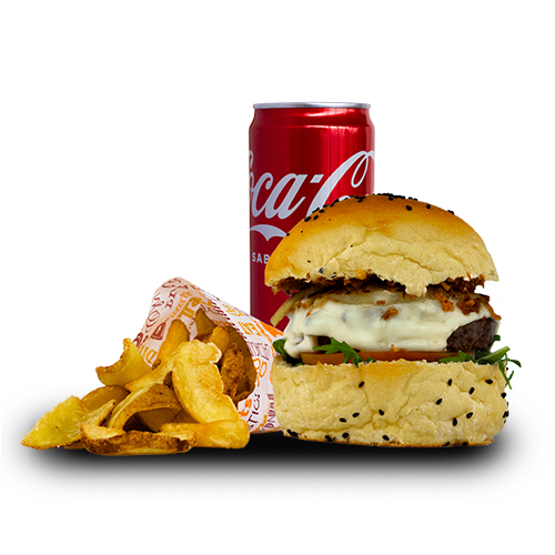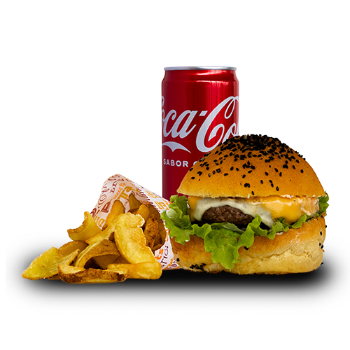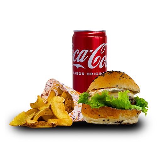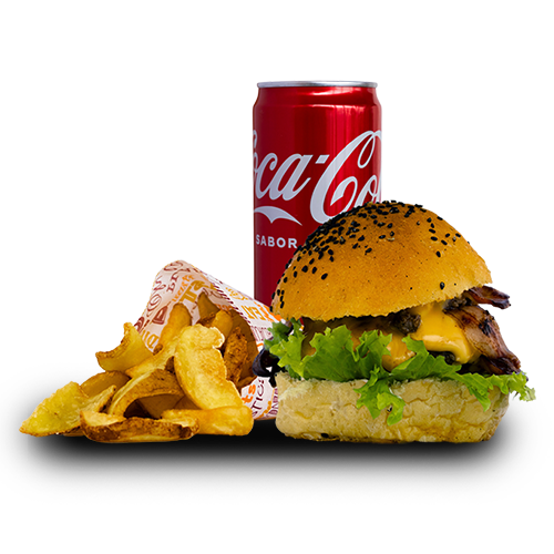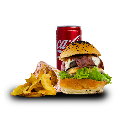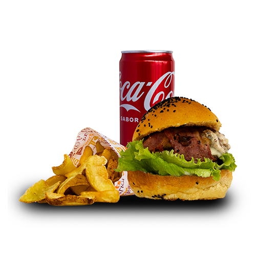 Hamburguer Vaca, Queijo Cheddar, Queijo Edam, Tomate, Alface, Molho da Casa, Sumo, Batata