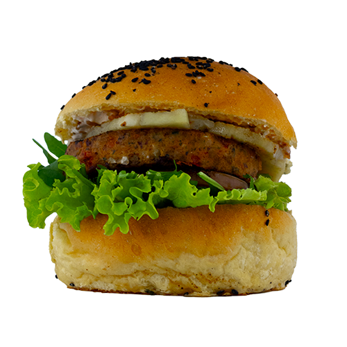 hamburguer Vegetariano 100%, Tomate, Alface, Rucula, Cebola Caramelizada, Molho Maracujá e Mel
