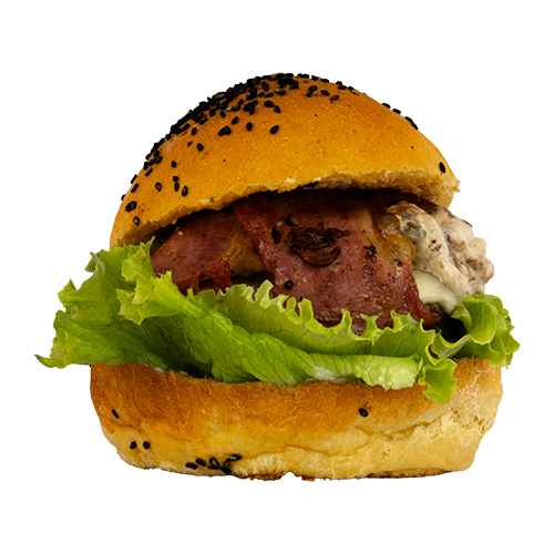 Hamburguer Vaca, Queijo São Jorge, Bacon, Queijo Edam, Tomate, Alface, Molho de Cogumelos