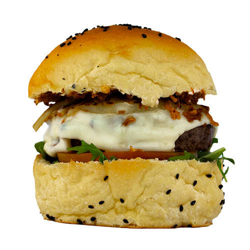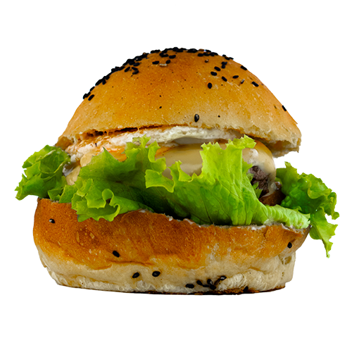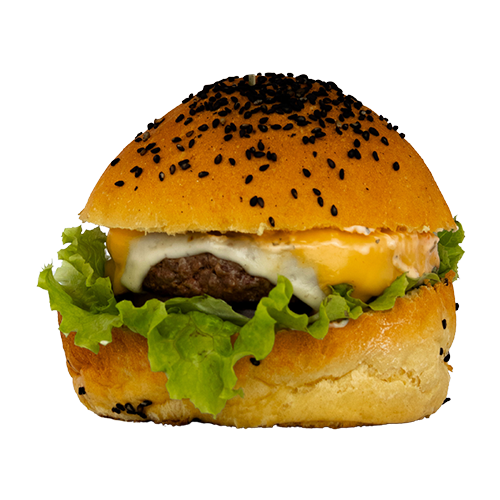 Hamburguer Vaca, Queijo Cheddar, Queijo Edam, Tomate, Alface, Molho da Casa