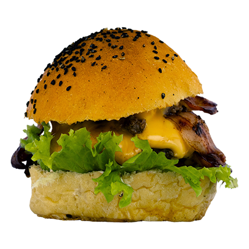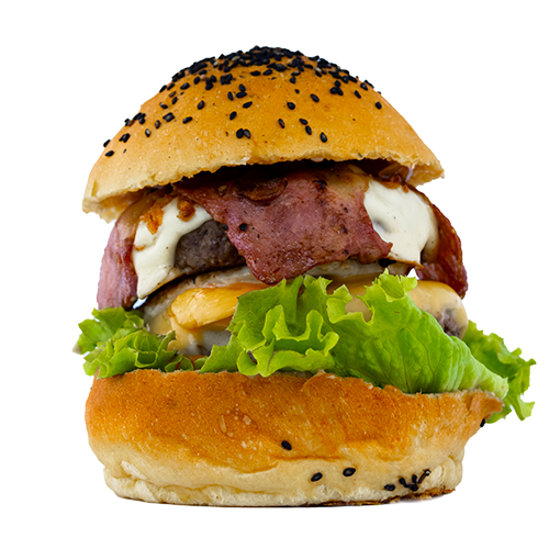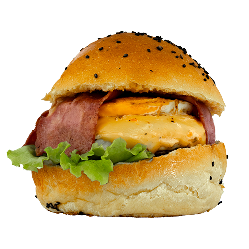 Hamburguer Vaca, Ovo, Bacon, Queijo Cheddar, Queijo Edam, Tomate, Alface, Molho da Casa