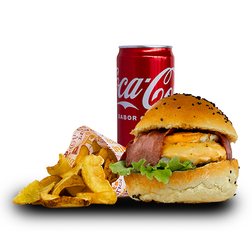 Hamburguer Vaca, Ovo, Bacon, Queijo Cheddar, Queijo Edam, Tomate, Alface, Molho da Casa, Sumo, Batata