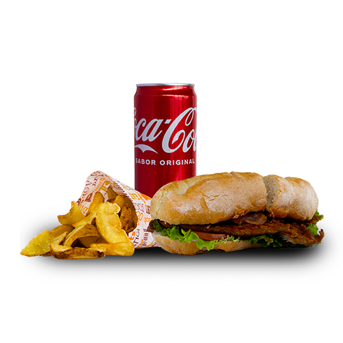 Bife Porco, Alface, Tomate, Cebola frita, Ovo, Cebolada, Becon, Molho da Casa, Sumo, Batata