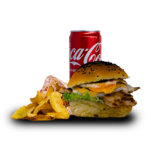 Peito Frango, Ovo, Queiho Cheddar, Queijo Edam, Alface, Tomate, Molho da Casa, Sumo, Batata